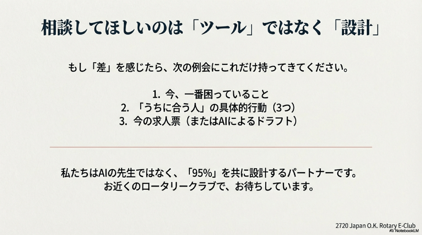 「参謀AIの使い方」と「95%に上げる仕組み」と「採用×業務改善の両輪」を、一緒に考える相手でありたいと思っています。