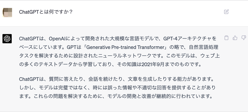 質問次第で、2021年9月までのオンライン上のオープンな情報から適切な言葉で答えてくれます。ChatGPT自身が答えていますが、「オンライン上のオープンな情報」が肝で、必ずしもオンライン上のデータは正しいものばかりではないから、出力された文章が正しいとは言えないので、出典元や検証は必要となります。