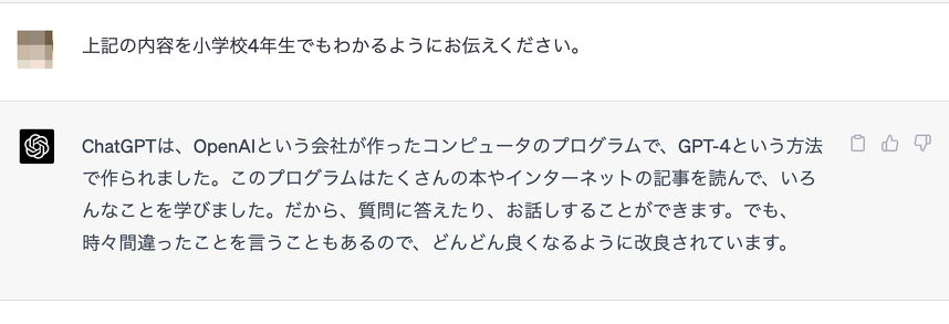 で、「上記の内容を小学校4年生でもわかるようにお伝えください。」と質問してみました。