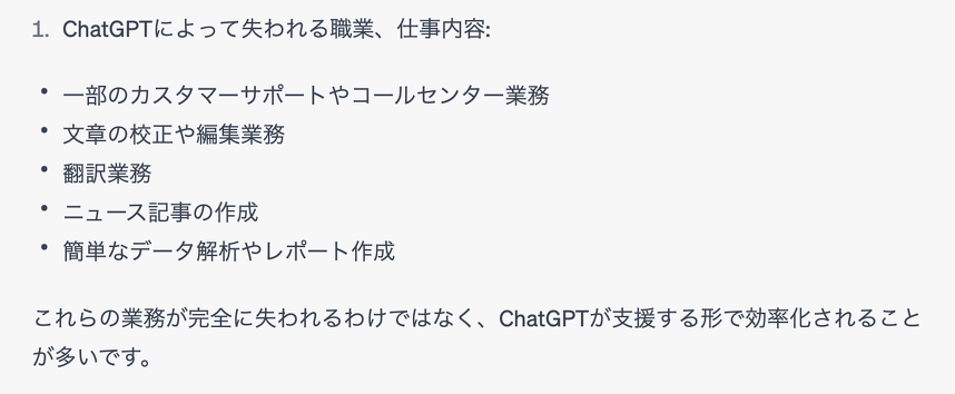 これらの業務が完全に失われるわけではなく、ChatGPTが支援する形で効率化されることが多いです。