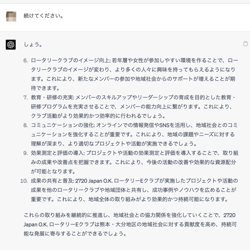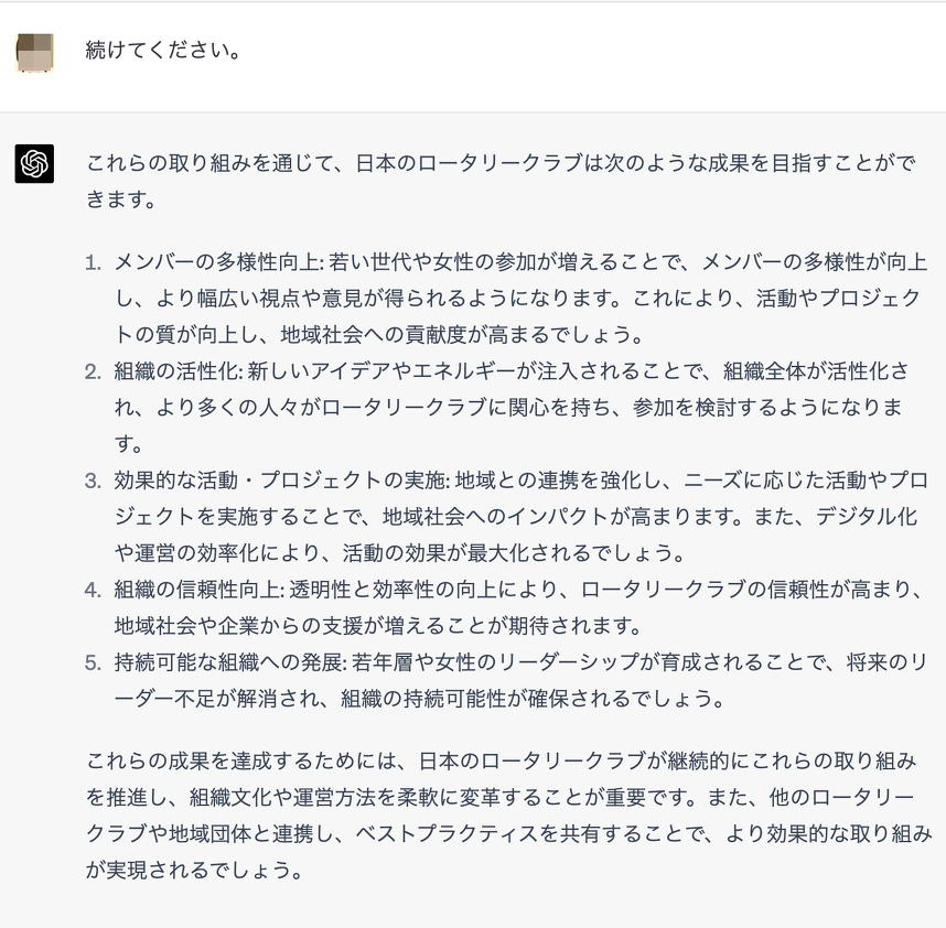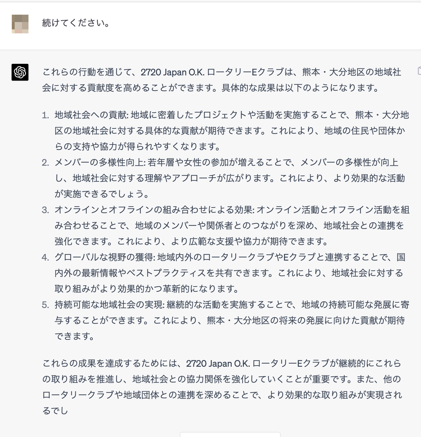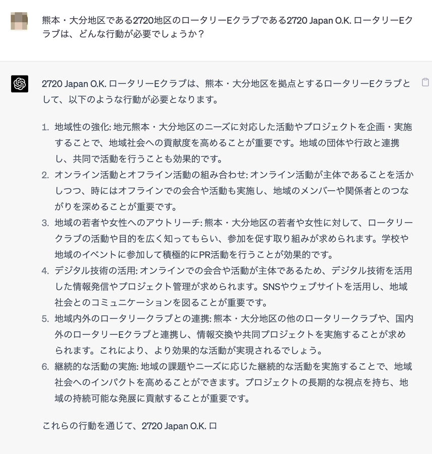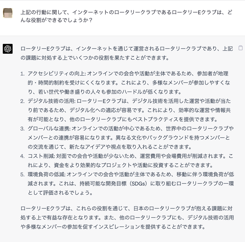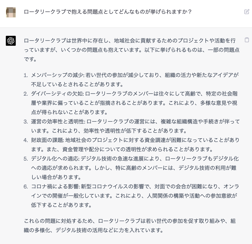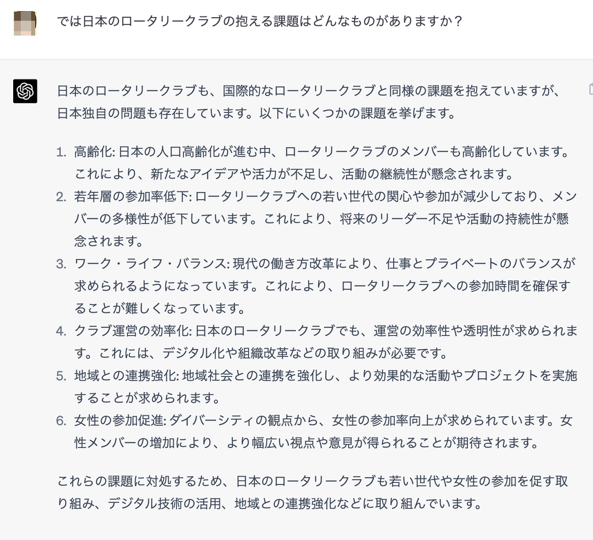 最後にせっかくなので、ロータリークラブのことをChatGPTに聞いてみました。(ChatGPTの性質上、2021年9月までの段階のことを聞いています)