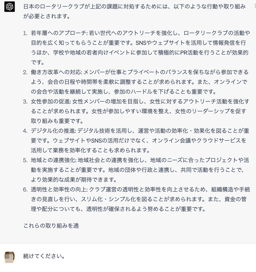 1.若年層へのアプローチ: 若い世代へのアウトリーチを強化し、ロータリークラブの活動や目的を広く知ってもらうことが重要です。SNSやウェブサイトを活用して情報発信を行うほか、学校や地域の若者向けイベントに参加して積極的にPR活動を行うことが効果的です。
