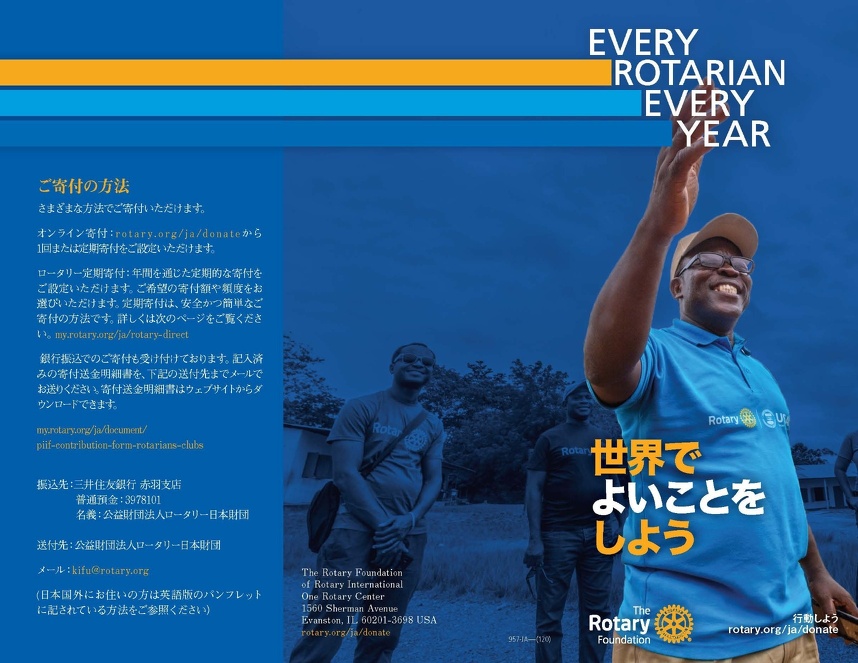 い、という目標があります。もちろん、あくまでも寄付ですので、強制はできません。わたしたちロータリークラブは、RIやロータリー財団のために存在しているのではない、クラブはクラブ独自の活動をしていけばいい、という考え方の方も中にはいらっしゃるかもしれません。しかし、RIが世界的に大きな事業を成し遂げてくれているからこそ私たちのロータリーバッジが世界に通用するのであり、ロータリー財団がしっかりお金を運用してくれているからこそ、グローバル補助金や地区補助金を使った大きな事業が行えるのだ、とも考えられます。