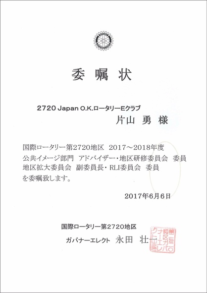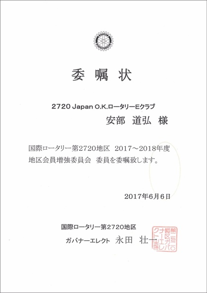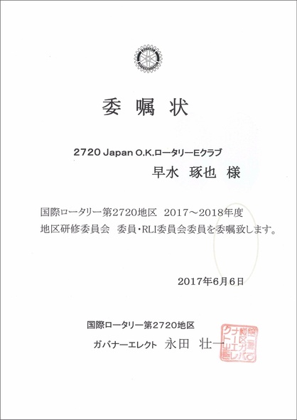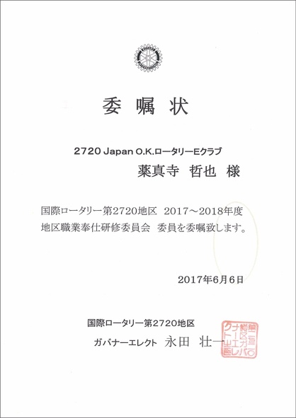 この度、2720 Japan O.K ロータリーEクラブに入会させていただきました。