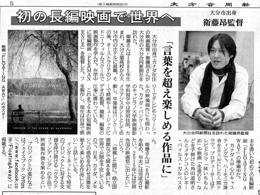 そして、現在は6月17日より、念願の大分での映画「フローティング アウェイ」の公開が決定し、ついに自分が監督をした映画を多くの人に見てもらえる事になりました。