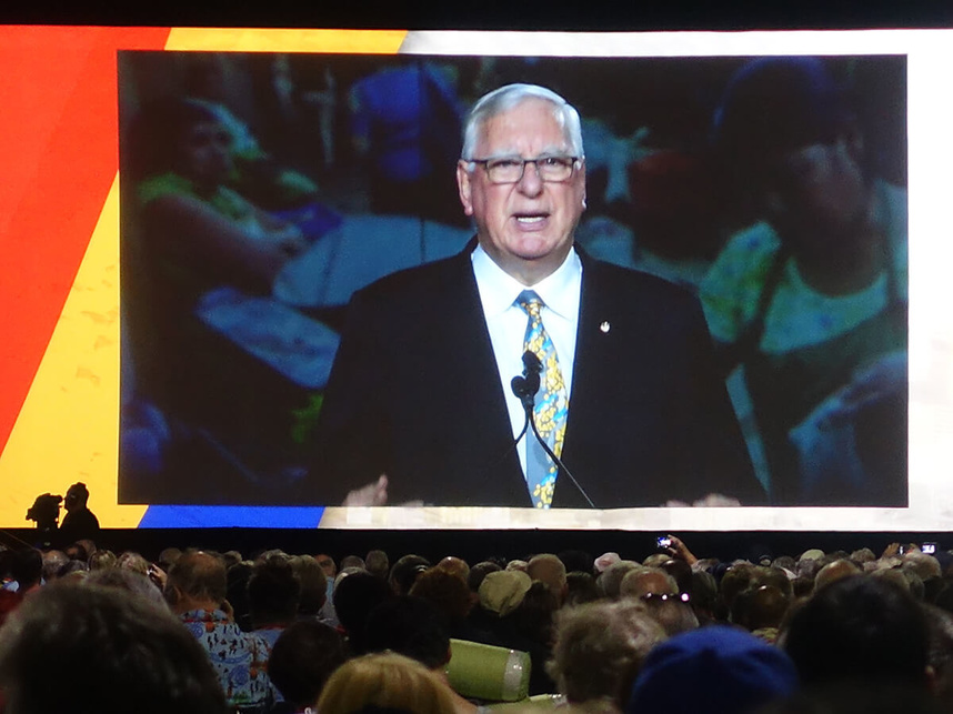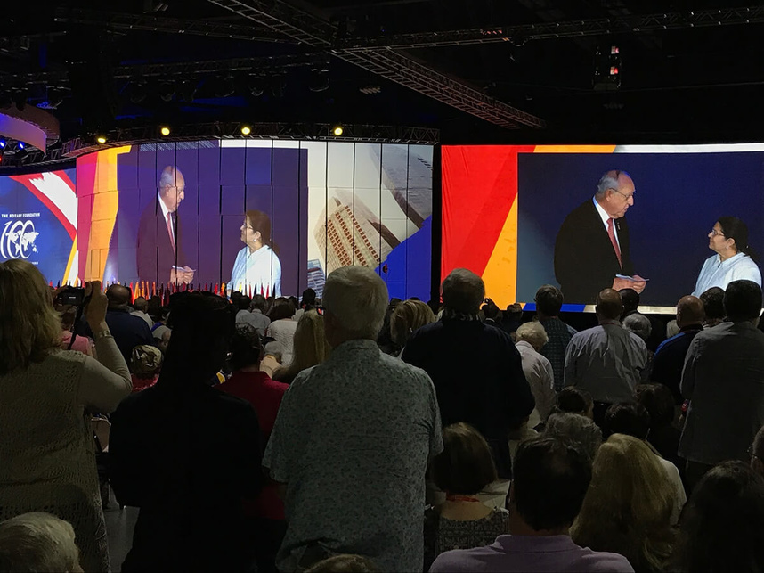 その後、ネイサン・ディールジョージア州知事の歓迎スピーチ、インドの慈善家・事業家、ラジャシュリー・ビルラ夫人の講演が続き、ビルラ夫人がロータリーのポリオ撲滅活動に新たに100万ドルを寄付することを発表しました。この発表時には私達を含めた会場の殆どのロータリアンが立ち上がり、賞賛の拍手を贈りました。ビルラ夫人はこれまで既に720万ドルをポリオ撲滅のために寄付しています。この様な素晴らしい瞬間に立ち会うことが出来るのも、国際大会ならではでしょう。スケールの大きさに圧倒されました。ジョン F. ジャーム国際ロータリー会長が今大会でネットワークと交流を広げるよう参加者に呼びかけました。