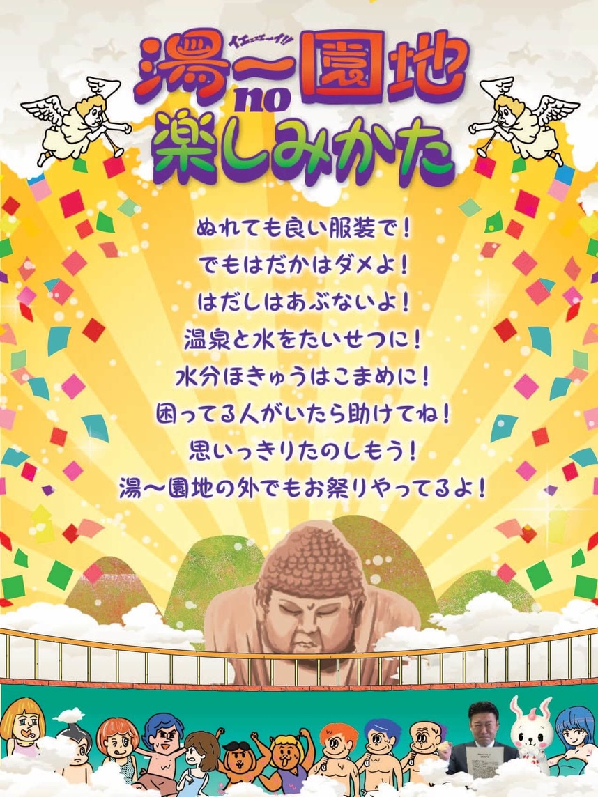 湯〜園地内はバスタオル姿がドレスコードと一応のルールを設け、したには水着を着ていただきましたが、そのドレスコードにて皆さんアトラクションを楽しんでいただきました。