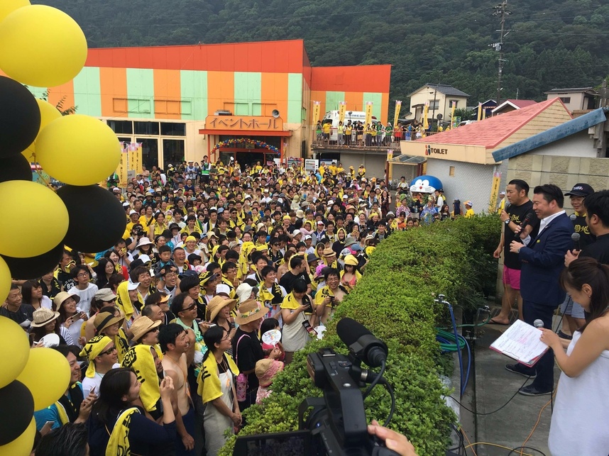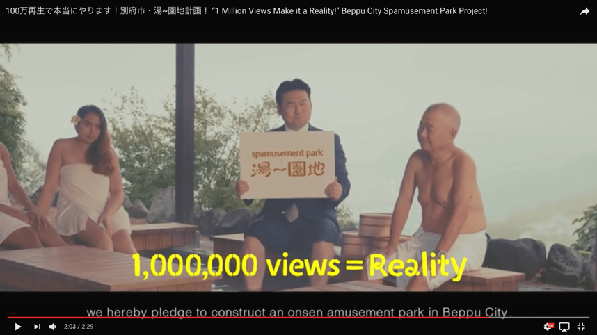 150人の市民CGなしで、バスタオル姿、温泉をつかった動画を作成。YOUTUBEで公開すると、市長がまさかののりで「100万回再生すると温泉テーマパークを実現します」との公約。すると3日間で達成し、これは「やってしまった」と市長もびっくり!ここから実現にむけての準備が始まりました。