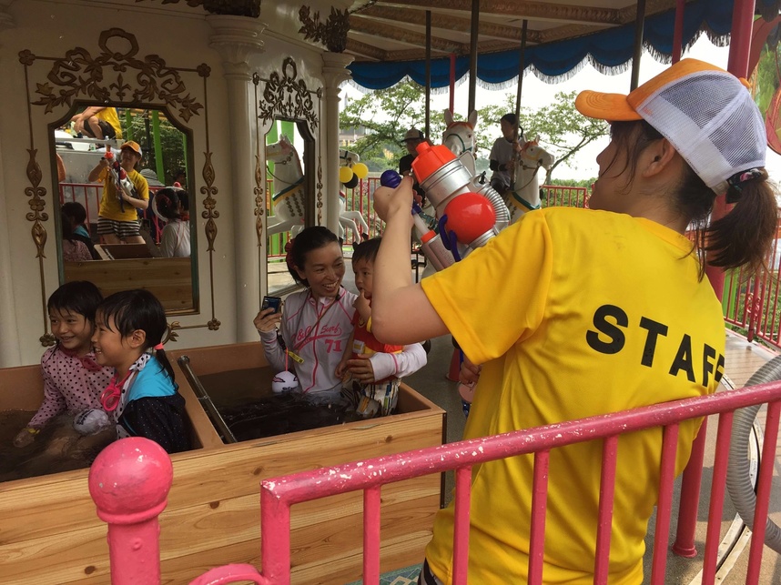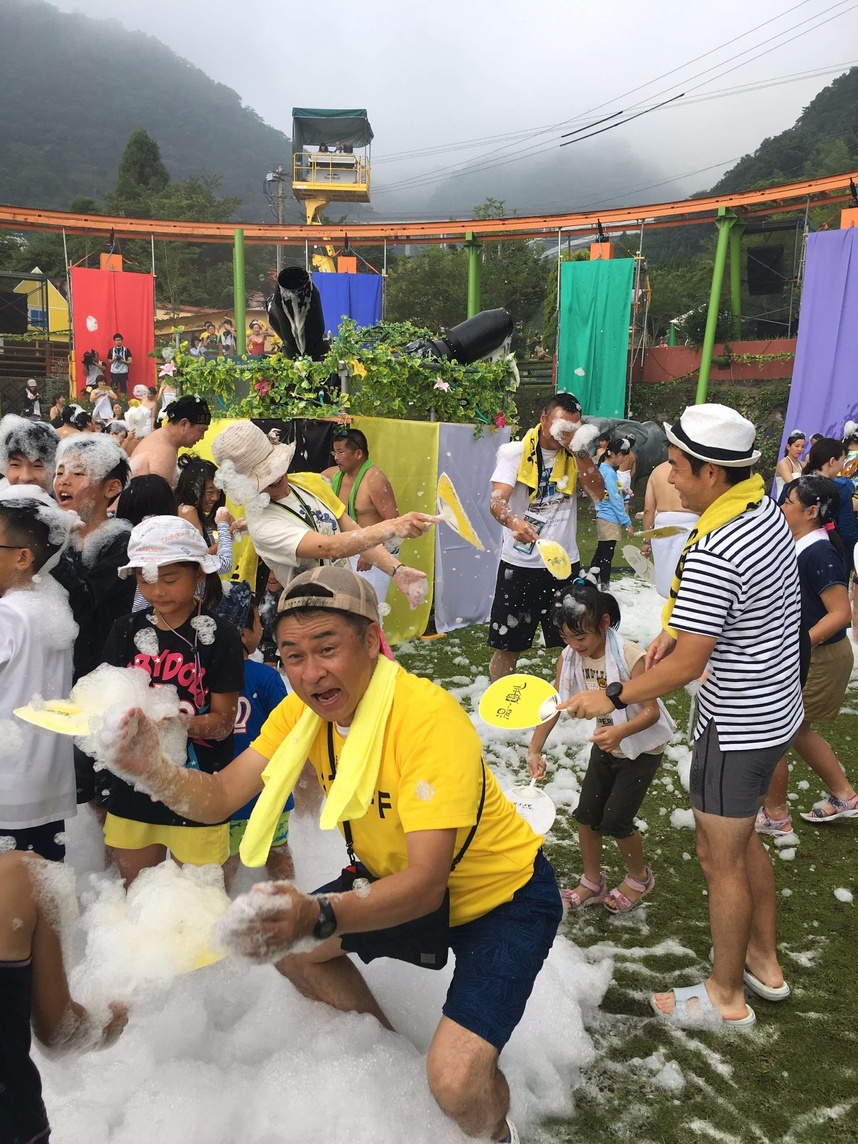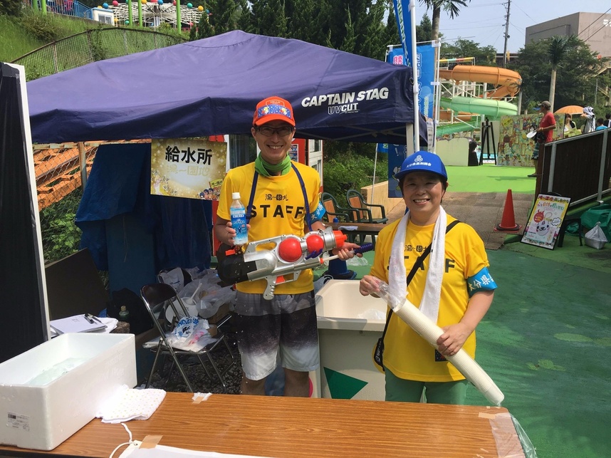 ボランティアスタッフは、6月に説明会を実施し、別府市、大分県のほかの福岡、熊本等から最終的にはのべ1200名が参加。当日は、遊び心いっぱいに湯~園地を盛り上げ、フラッシュモブ隊55名、1時間に1度のダンスや朝7:00からのディスコお出迎え隊でフィーバー、コスプレで水を配ったり、ゾンビの衣装でアトラクションに参加したり。。。列に並ぶ人をうちわであおぎ、笑顔と元気で、熱中症対策も行いました。それに加えて、エンターテインメント性たっぷりに、もてなしていただきました。