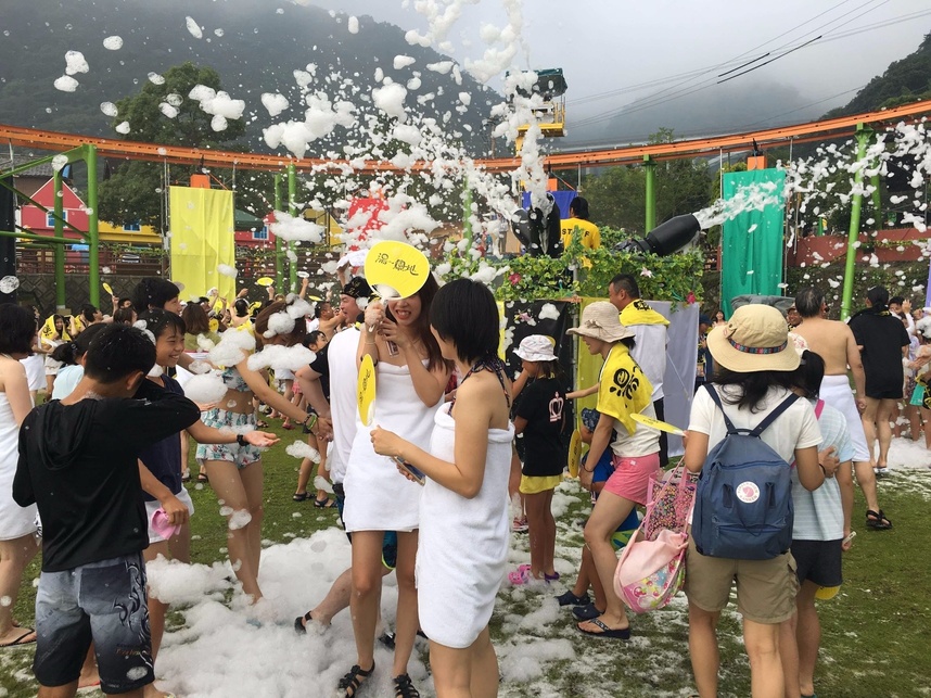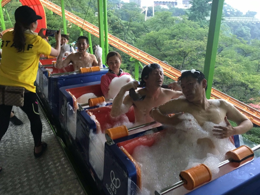 初日は日本全国より4000名の方が訪れ、泡をつかった「温泉バブルジェットコースター」は最長で4時間まちの行列も!!「温泉メリーゴーラウンド」では4人ではいれる桧風呂を配置し大人気で、「全長80mのかけ湯スライダー」はスリル感がいっぱい、「湯~覧吊り橋」では絶景を眺めながらミストが吹き出しびしょびしょになりました。