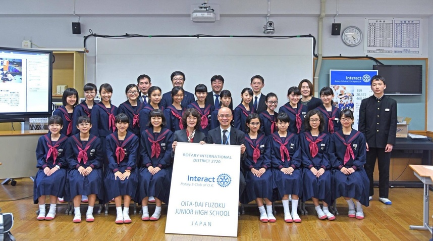 植山会長の母校でもあり、皆さんの期待が一心に集まっているところです。国際ロータリーからの認証を待っている段階ですが、すでに例会はスタートしております。まだ具体的なプロジェクトも行ってはいませんが、附属中学校の学生らしい素晴らしい活動が行えることをうれしく思っています。OKEクラブの成長とともに、大分大学附属中学校インターアクトクラブもいっしょに学びながら、成長していきましょう。