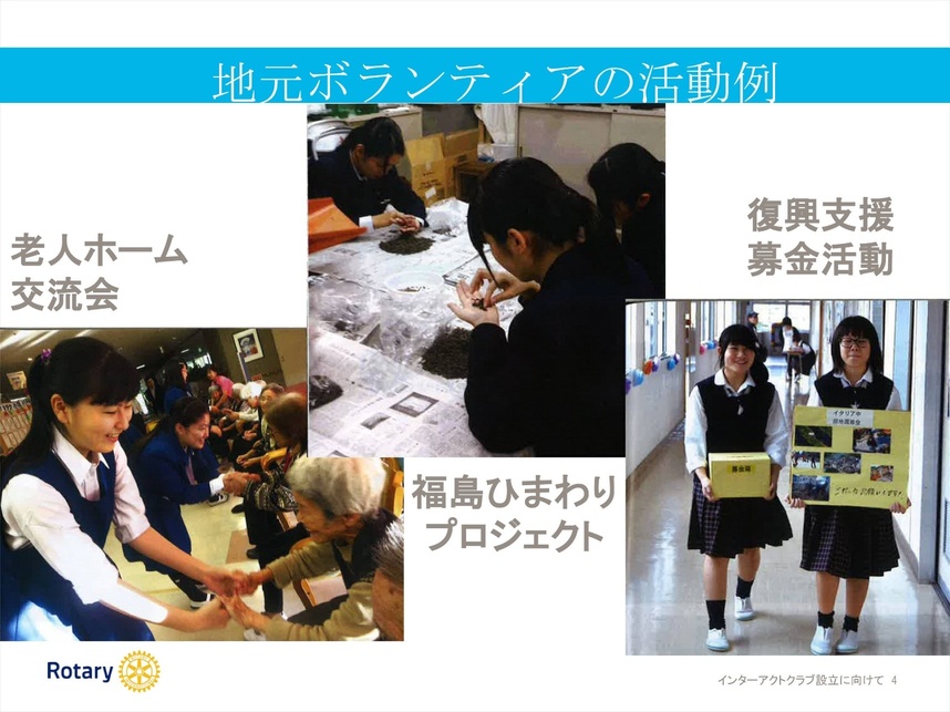 年に二つ以上のプロジェクトを行うよう定められています。一つはグローバルな国際的プロジェクト。海外のこどもたちへの文房具などの教育支援や募金活動などです。もう一つはローカルな地域に役立つプロジェクト。児童福祉施設や老人ホームなどへの慰問、地域の清掃活動などもこれに当たります。
