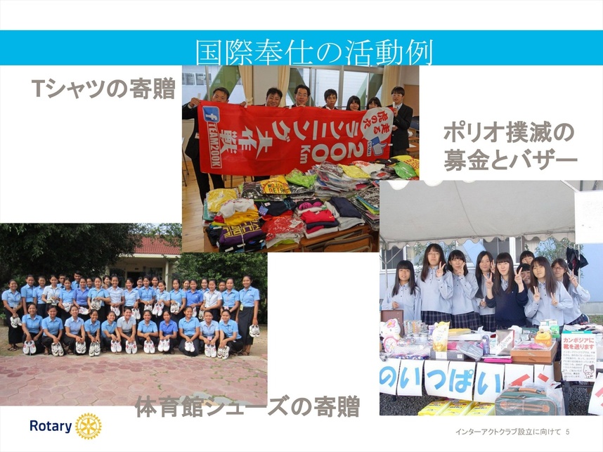 福徳学院インターアクトクラブでは、高校を卒業する生徒から体育館シューズを譲ってもらい、カンボジアやフィリピンなどの学生へプレゼントしてきました。また24時間募金活動やロータアクトとの清掃活動なども行いました。ただ受け入れ先から「現金じゃないとだめ」などと断られ、悔しい思いも何度か経験してきました。