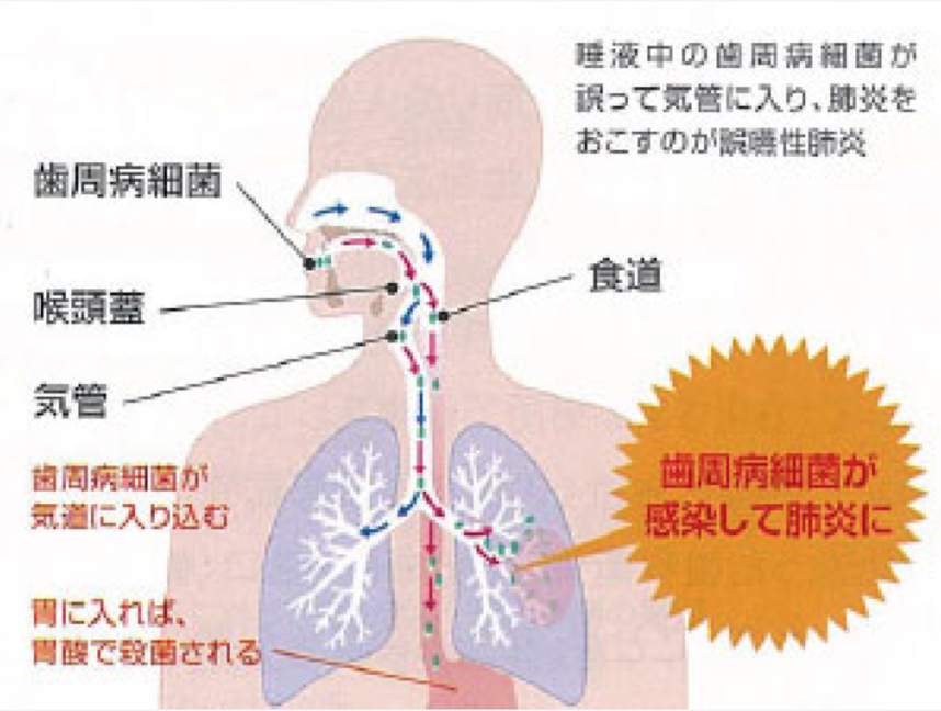 そのように入り込んだ歯周病原性細菌などのお口の中の細菌が肺炎を起こしやすくすると考えられています。