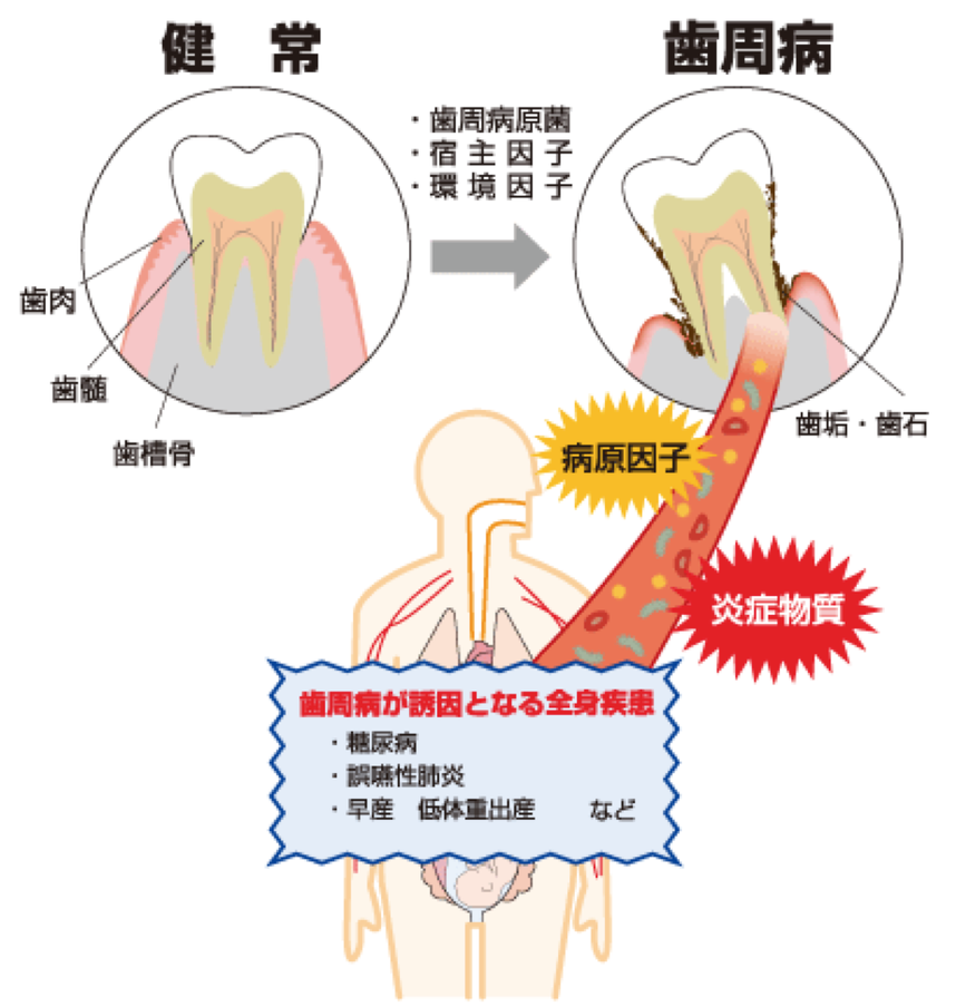 歯周病原性細菌によって歯周組織に炎症が起き、深い歯周ポケットが形成されるような状態になると、歯周ポケットと呼ばれる溝から生体内に侵入した細菌そのものや細菌由来の病原因子に加え、炎症の場で作られる物質(サイトカイン)が歯肉の血管を通じて血液に流れ込む。これが全身の組織や臓器に何らかの影響を与えると考えられています。