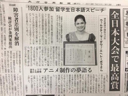 第7回留学生日本語スピーチコンテストで本学のスリランカ人留学生が最高賞の外務大臣賞をもらいました。1800名の応募者から日本一になりました!また、その学生のおかげで、「うちのこニッポンで元気ですか」TBSから密着取材を受けています。GWに放映予定です!ということで、3口。