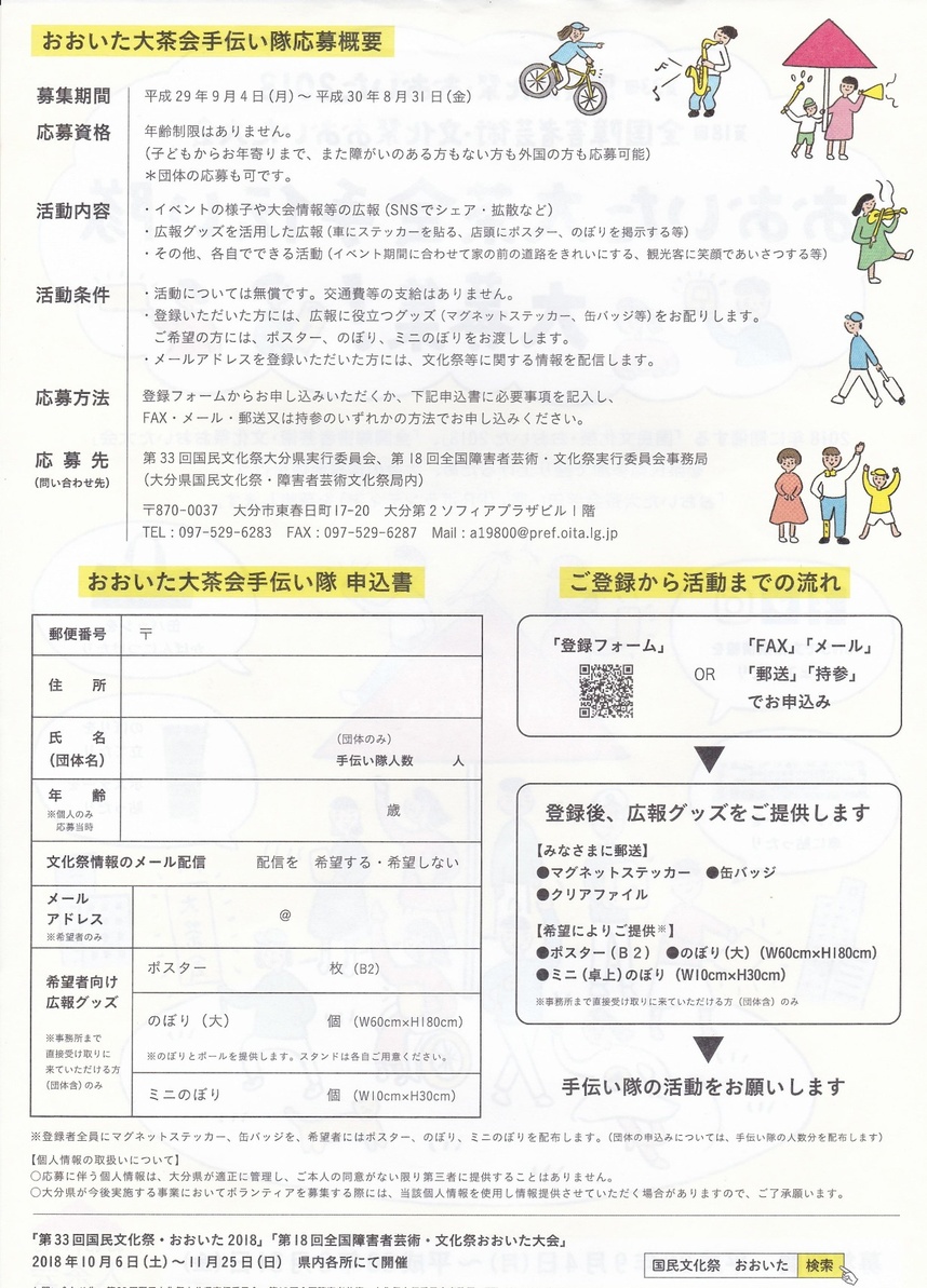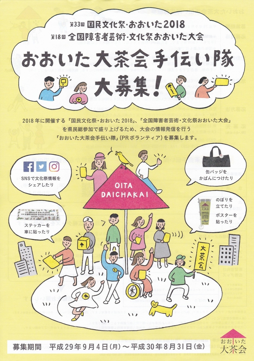 2つの文化祭のテーマは「おおいた大茶会」。よく皆さんに「お茶会をするのですか?」と、聞かれます。もちろんお茶会もあるのですが、秀吉の北野大茶会になぞらえ、老若男女、障害のある方もない方も、外国の方もみんなが参加できる文化のお祭りという意味あいです。
