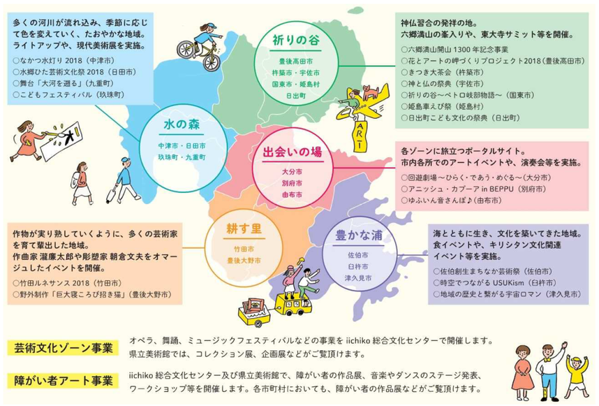 今回の文化祭では、大分県内18の市町村を、地勢や水脈によって5つのエリアにわけ、エリアごとにテーマを定めて事業が実施されます。