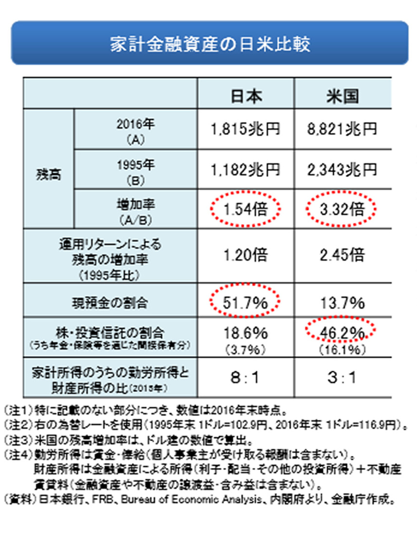 平成28事務年度金融レポートの中の家計金融資産の日米比較データによると、我が国の家計金融資産の伸びは過去20年間で1.54倍に対して米国は3.32倍となっています。これは米国と我が国では、家計金融資産の構成比に大きな差(米国は金融資産の46.2%が株式・投資信託であるのに対し、我が国は51.7%が現預金である)があること、また米国は401(k)やIRA(企業型確定拠出年金、個人向け確定拠出年金)の普及活動により資産の分散を後押ししてきた結果だと分析されています。