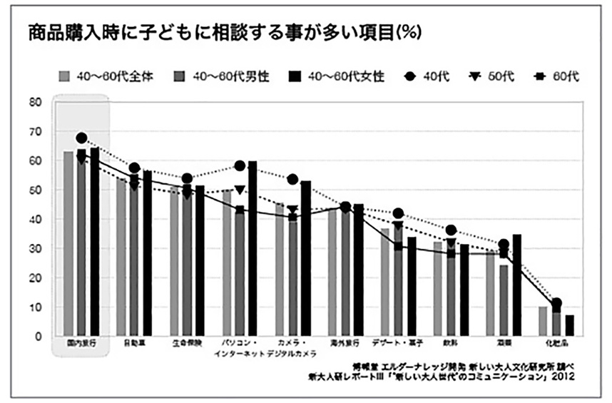 そこで、この層が買い物をするときに信頼を寄せる情報源を調べてみると(博報堂+エルダーナレッジ開発+新しい大人文化研究所「新大人研レポートⅢ〝新しい大人世代〟のコミュニケーション」、2012年)、「商品購入時に子どもに相談することが多い項目」のなかで国内旅行はトップです。このことからも、団塊の世代の子どもである世代に向けた魅力創出や、情報発信をおこなうことで、新たなマーケットを開拓するのみでなく、そこから世代を超えた二次拡散が期待できるのではないかと考えました。情報の信頼性や質は、バイラルマーケティングの基本です。
