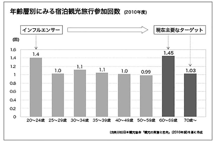 そして、2010年度の年齢層別宿泊観光参加回数をみると、60代が主要なターゲットであることがわかります。しかしながら、70代になると宿泊を伴う旅行回数はぐんと下がります。特に団塊の世代が70代に突入する2017年以降、体力の低下とともに旅行回数が激減するため、シニア世代に依存する需要維持策は顧客が先細ることが想定されていました。加えてこのセグメントは、いわゆるレッドオーシャンであり、誰もが狙う市場、つまり競争が激しいのです。