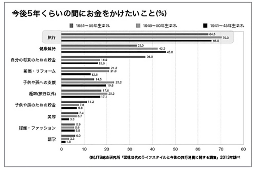 2013年にJTB総合研究所の発表したシニア層とその予備軍を対象にした「団塊世代のライフスタイルと今後の旅行消費に関する調査」では、今後5年間でお金をかけたいこととして「旅行」と回答した人が最も多くなっています。