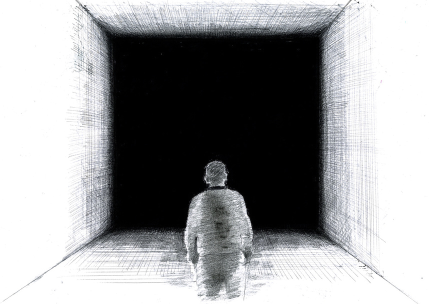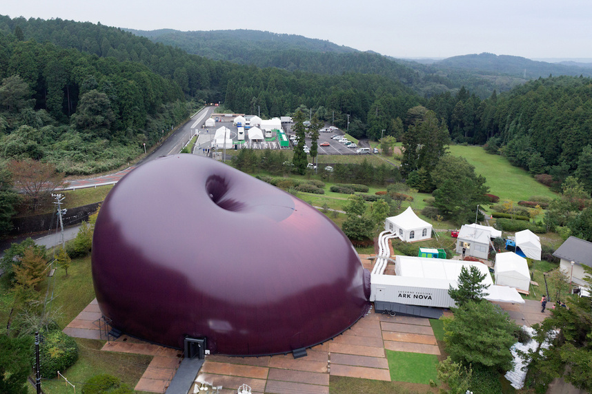公園を数分歩き、最初に見えてくるのは四角い建築です。これは、昨今カプーア氏が取り組む、彫刻と建築が融合する作品。別府のためだけの新作『void the pavilion』です。大きさは幅6m×高さ6m、奥行きは12mあります。その中に入ると真っ暗な暗闇が現れます。その暗闇は、この世の全ての光を吸収するかのようです。それはまるで、ブラックホール、世界の果て。ぜひ、少し我慢して黒い壁を見続けてください。あることに気がつくでしょう。