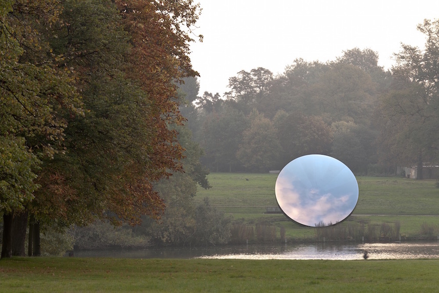 そしてその空間『コンセプト・オブ・ハピネス』を出て、目の前に見えてくるのは丸い球体。よく見ると、雲が流れ、時には鳥の飛ぶ姿が写り込んでいます。これは直径5mのステンレスの鏡です。カプーア氏の代表作『Sky Mirror』(http://anishkapoor.com/230/sky-mirror)です。日本初公開、本展のために特別に制作していただきました。空を地上にもたらすこの大きな鏡は、ここと、どこか別の場所を繋ぐ扉、異世界への入り口のように感じられることでしょう。