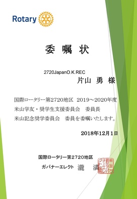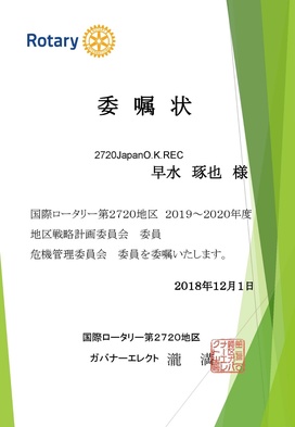 2019-2020年度の地区委員として、クラブから6名が委嘱を受けました。