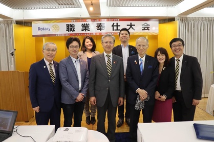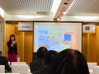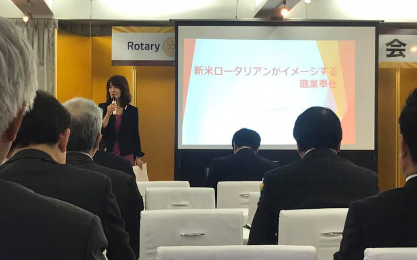次に、我がクラブを代表して植山朋代直前会長が「新米ロータリアンがイメージする職業奉仕」というテーマでお話しました。内容は、我々Eクラブが今は最先端なクラブに思うでしょうが、2025年の大阪万博にはVRでのバーチャル来場が可能になり、世界中から80億人もの来場を見込んでいる。だから、インターネットでの例会はいずれ当たり前となると思います。と、我がクラブの活動が未来のロータリー例会のスタンダードになると言い切っていました。かっこよかったです(笑)そして、会場の皆さんに、「あらゆる会に所属されている方が多いと思いますが、もし無人島に流れ着いてしまうならどの会で流れ着きたいですか?」と質問されました。「私は我がロータリークラブ(Eクラブ)です!なぜなら、あらゆる職業の方がいるのできっとその無人島に小さな街ができると思うからです。わたしにとって職業奉仕とはそういうことです」と説明されました。私は、職業奉仕とは人の役にたつ職業は全て職業奉仕なのだと改めて考えさせられました。もちろん、人の役に立つから職業が成り立つのですが、企業の寿命は30年と言われていましたが、2017年に倒産した企業の平均寿命は23.5年(東京商工リサーチの調査による)と短命化が進む昨今、企業を継続し続けることは難しく、ほんとうの意味での職業奉仕とは続けることではないのかと、思いました。