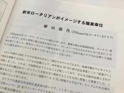 私は予定通り30歳でロータリークラブに入会をさせて頂き、日々先輩ロータリアンからの指導の下、様々な役目を与えられ、成長の機会を頂いております。本日登壇させて頂いている事を含め、ロータリアンとして過ごしてきた4年間は他では出来なかったであろう経験ばかりであったと思います。