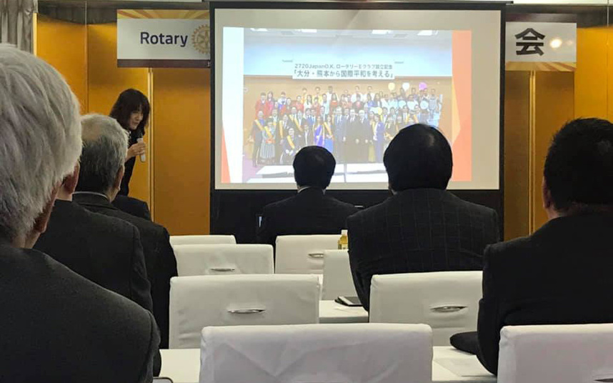 次に登壇されたのは、我がクラブの永田淳子会員の旦那様である、永田壮一パストガバナーでした。「職業奉仕とは?」というテーマでお話してくださいました。ロータリーにとっての職業奉仕の基本を説明してくださり、その中でも私は「超我の奉仕」「利他の心」「黄金律:何事でも人々からしてほしいと望むことは、人々にもその通りにせよ」というロータリーの「奉仕の理念」全てを職業で実践することだと、説明していたのが印象的でした。そして、2016年4月に起こった、あのおぞましい熊本大地震での経験をお話くださいました。永田パストガバナーの経営される病院は震源直下だった益城町にあり、ご自身の病院もぐちゃぐちゃだったそうです。そのような中、災害医療調査本部を立ち上げ、その本部長として全体の指揮をしたそうです。その時のことを振り返り、地震後の医療支援活動を一度もロータリーと結びつけて考えたことはなく、ロータリアンとしての行動ではなかった。それは、人間、医師としての行動だったと説明していました。そして、永田パストガバナーにとってそれは「目的と効果」がはっきりしているのが奉仕活動で、私のしたことは職業奉仕に当たらないと思う。と言われていました。でも、ロータリー活動を通じて「奉仕の理念」が身についているからこその行動だったと思うので、私はまさしく永田パストガバナーの行動はご自分の職業人としての強みを生かした職業奉仕だと思いました。そして、永田パストガバナーが一番強調していたのが、ロータリーを外からの視点でみられたということでした。それは、たくさんの人道的支援や義援金をロータリークラブからいただいたことは感動的で、改めてロータリーの素晴らしさを実感できる大きな機会であったと感想を伝えていました。