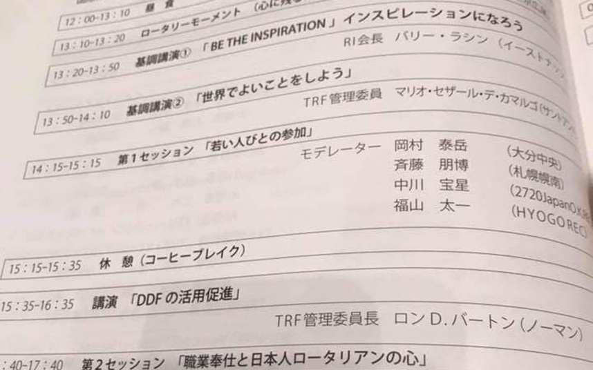 ⅱ、また今年の5月には小豆島で行われたジャパンライラセミナーに派遣して頂きました。セミナーでは三木明RI理事から日々お声かけを頂くと共に、ご自身の著書にサインとメッセージまで書き添えて頂き、繰り返し読ませて頂いております。また姫路ロータリークラブの坂東様からはセミナー運営の資料やご自身が会長の時の卓話集を頂きました。4日間に渡るライラセミナーですっかりライラの虜となってしまい、受講生のみならず私の胸にもライラの火を灯されるのを感じ、地区に持ち帰り火を灯さなければならない!という強い使命感を抱いておりました。この様な場に立たせて頂いているのも三木明RI理事と羽部パストガバナーのご推薦のお陰であります。