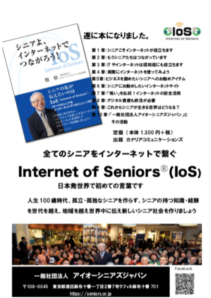 その目的実現の為に2017年12月に「全てのシニアをインターネットに繋ぐ」という理念での「Internet of Seniors」(IoS)を提言し、その活動の啓蒙と拡大のために「一般社団法人アイオーシニアズジャパン」を立ち上げました。私81歳での起業でした。