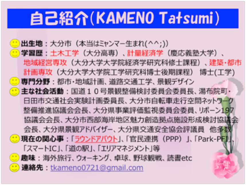 ところで、私は40年間、大分高専の教員をしてきまして、昨年3月に退職したのですが、専門分野は「道路交通工学」と「都市計画」でしたので、この2つの分野をつなぐ「ラウンドアバウト」(環状交差点)を、今回は紹介させていただきます。