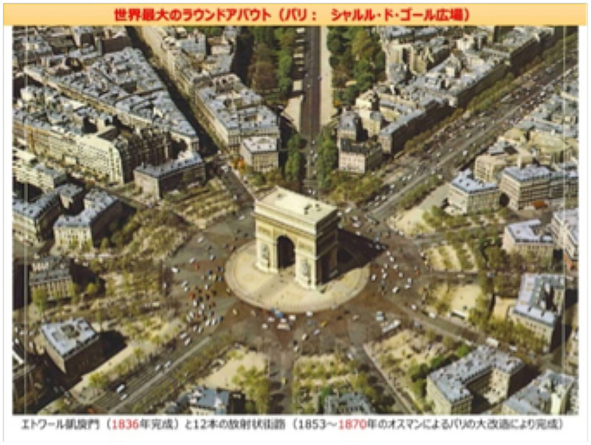 皆さんもよくご存じのパリにあるエトワール凱旋門とそれを囲むシャルル・ド・ゴール広場(建設当初はエトワール広場で、その後現在の名称に変えられている)ですね。ここは、世界最大のラウンドアバウトと言われています。ナントいっても6車線の多車線ラウンドアバウトでして、まずフランス人でないとスムーズに通行できません。