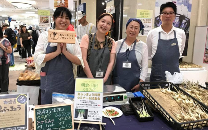 被災3日後、朝倉入りし、その被害の大きさにより事業の全てをキャンセル。朝倉でボランティア活動に入る。毎日のボランティア活動の中、被災地が完全に復興しない事や農業の復興の遅れに伴って地域の衰退が急速に加速すること、そして自ら命を絶つ人が多く出る事実を知る。そのような中で、被災地に賑わいを取り戻しつつ、新たな産業を生み出す必要性を感じ、島らっきょう栽培を開始。これまで災害で被災した農地には大量の土砂が流入し、その土砂の撤去をすることが復興のスタートとされていた。しかしながら、その土砂の撤去に時間を要するため、様々な弊害を起こしている。島らっきょうの栽培は土砂を撤去せず、または、栽培の過程で土砂を少しずつ除去するやり方で、試行錯誤しながら行った農業復興である。