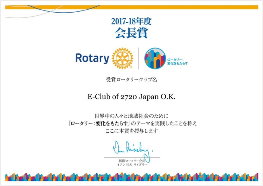 今年度は本当にありがとうございました。これからの2720 Japan O.K.ロータリーEクラブ様の戦略計画の実施によるクラブの活性化を願い、皆様方のご支援に感謝申し上げて、この一年間の御礼とさせていただきます。
