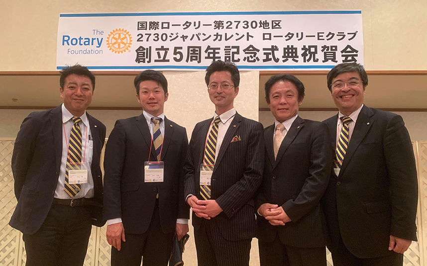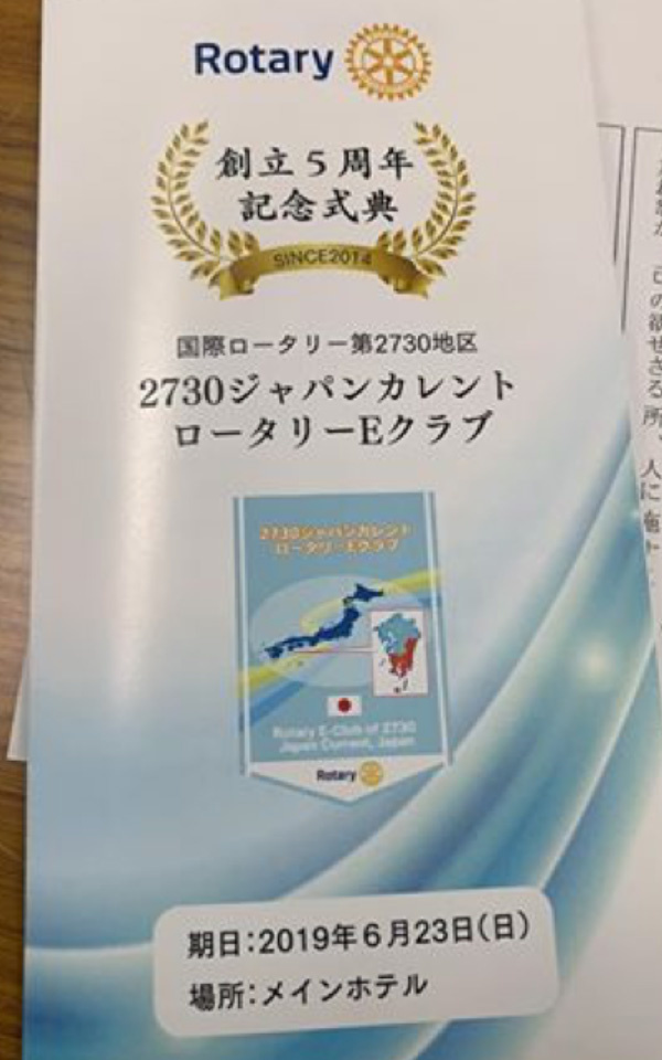 「ロータリーデー」と同日に私は「2730ジャパンカレントロータリーEクラブ」の創立5周年記念式典に参加していました。先輩Eクラブでもありますし、私たちの創立の時いろいろとご指導いただいた経緯もあり、この機に会長として少しでも恩返しをしたいと思い、こちらを優先させていただきました。