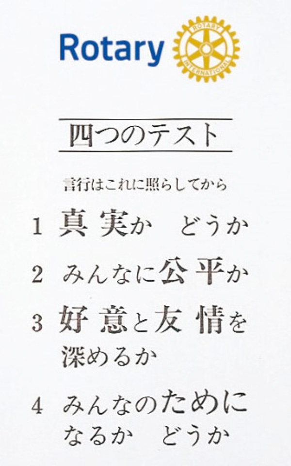 皆さんが当クラブに入会されたとき、バッチや「ロータリー入門書」といっしょに、「四つのテスト」を受領されたかと思います。