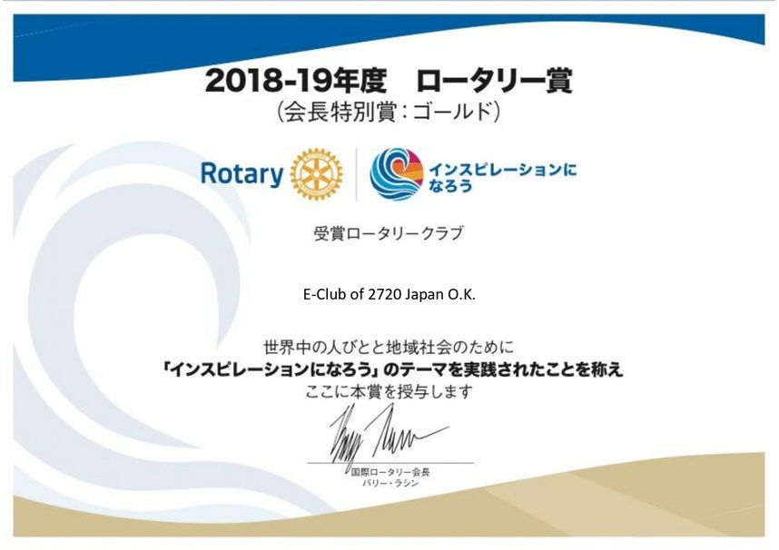 先日髙山パストガバナーよりご連絡があり、今年度「2018-19年度のロータリー賞(会長特別賞:ゴールド)」を昨年度に続き2年連続の受賞というご報告をいただきました。