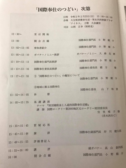 2020年2月23日に大分県消費者生活・男女共同参画プラザ「アイネス」で実施された2019年~2020年度国際奉仕部門セミナーへ、早水会長と松浦(R財団委員長)で参加しました。