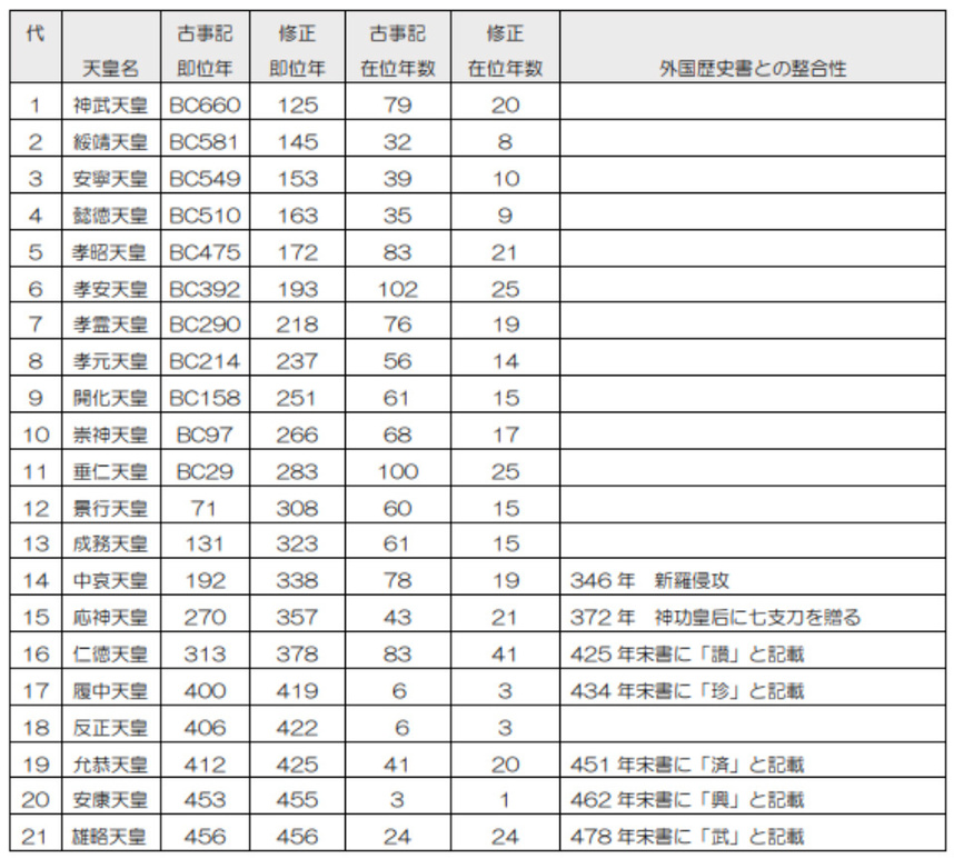 神武天皇から仲哀天皇までの時期は、1年を4年に計算する4倍暦年とし、応神天皇から安康天皇逝去までは2倍暦年とし、推古天皇以降は即位年、在位年共に実数を用いることにして、在位年数の倍率を頼りに計算をし直しました。仲哀天皇から先を4倍暦年にしたのは、仲哀天皇崩御後、神功皇后が実子・応神天皇とともに長期にわたって絶大な権力を持ったので、暦年変更が可能なのはこの時期以外にはないと考えたからです。