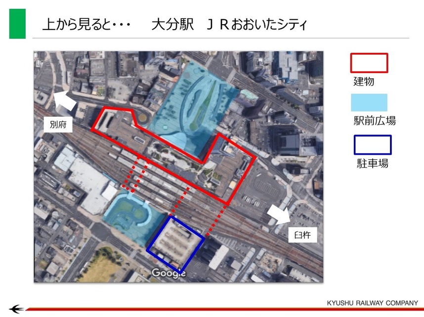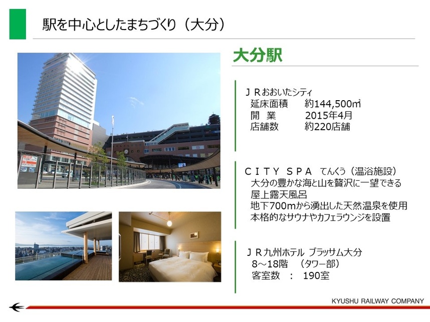 そして、今のところ一番新しいのが地元の大分です。間もなく開業から5年となります。大分駅ビルの特徴はホテルと併設していること、博多より広い屋上広場があること、そして、最上階に温浴施設の「てんくう」があることだと思います。なお、駅ビルの土地と建物は全てJR九州本体のもので、我々はそこを運営管理しテナント様に賃貸しています。JR九州の駅ビルは全てそのようになっています。