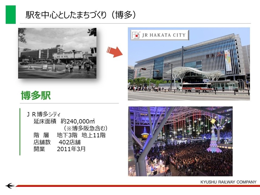 それから次が博多駅です。博多駅ビルは新幹線鹿児島ルートの完成に合わせ2011年の春に完成しました。駅ビルとしても規模はJRグループの駅ビルの中で最大で、阪急デパートさんもテナントとして入ってもらっています。また、駅前広場のレイアウトの変更に伴って、大屋根を設けてその下をイベント広場として活用できるようになっています。地元のお祭りやクリスマスの際には本当にたくさんの人が集まり賑わっています。また、屋上広場もあってたくさんの人が訪れています。