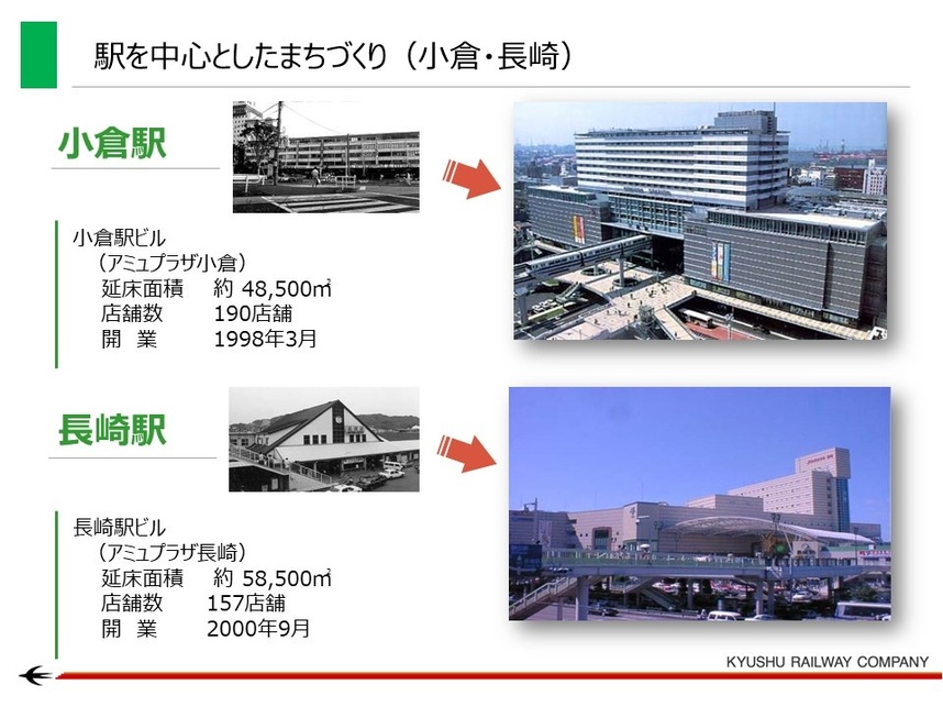 4ページにありますように現在のところ九州の大型駅ビルは大分のほか、博多、小倉、長崎、鹿児島中央にあります。ここからは開業が古い順にそれぞれを紹介します。