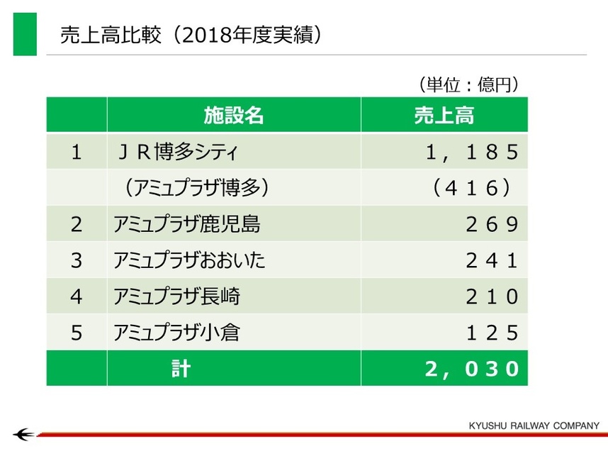 11ページには各駅ビルのテナント売上高を示します。博多の駅ビルがいかに収益力があるかお分かりいただけるかと思います。5つの駅ビルの合計の売上高は2000憶円を越えています。