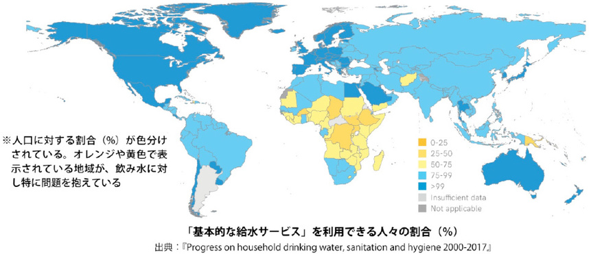 現在、世界人口76億人のうち、71%が安全に管理された水を飲めている一方で、2%に相当する1億4400万人が池や川の水を直接利用せざるを得ない状況であり、うち半数以上はアフリカ大陸居住者といわれています。