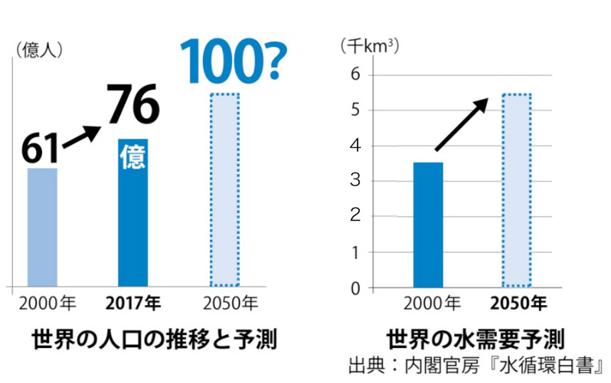 世界の人口は2000年から2017年までの17年間で約15億人増えたと推計されますが、この先2050年時点で仮に100億人に達した場合、水の需要は55%増加することが予測されています。