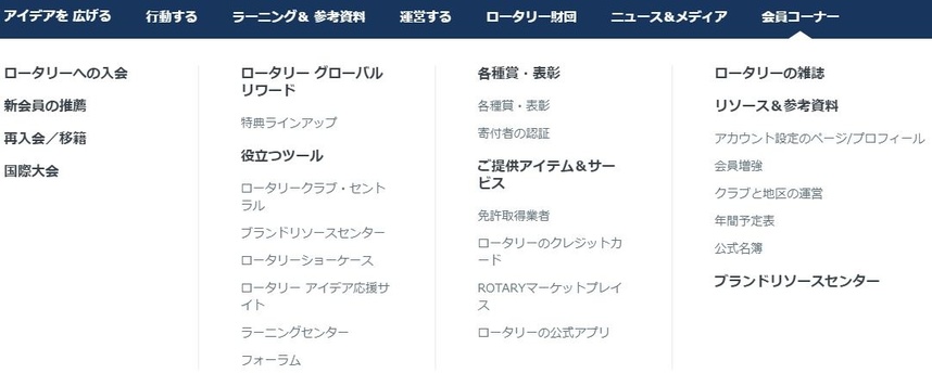 「会員コーナー」のカテゴリには「ロータリーへの入会」(入会を検討される方向けに全体像を俯瞰するサイト)や「新会員の推薦」ツールならびに別カテゴリに分散する「役立つツール」などが配置されています。